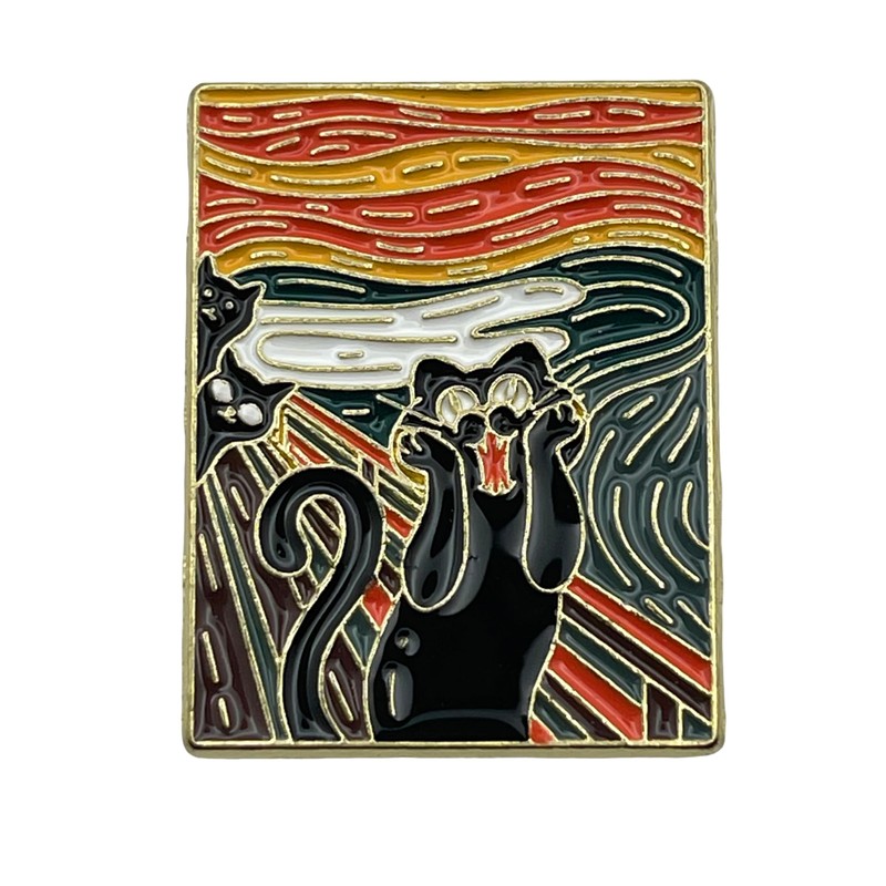 This is a cute black cat pin with a motif of munch.
