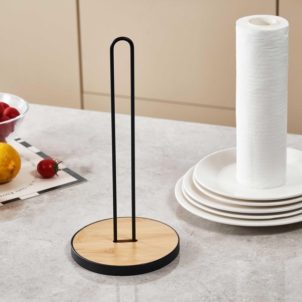Eden & Willow Premium Metal Kitchen Roll Holder, Black Paper Towel Stand with Bamboo Wooden Base