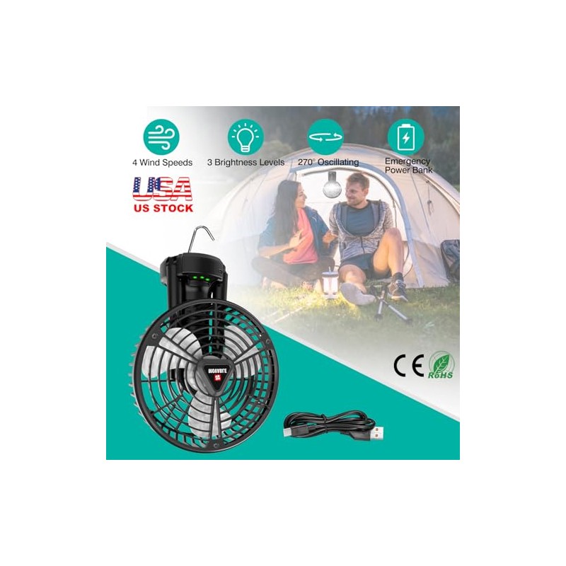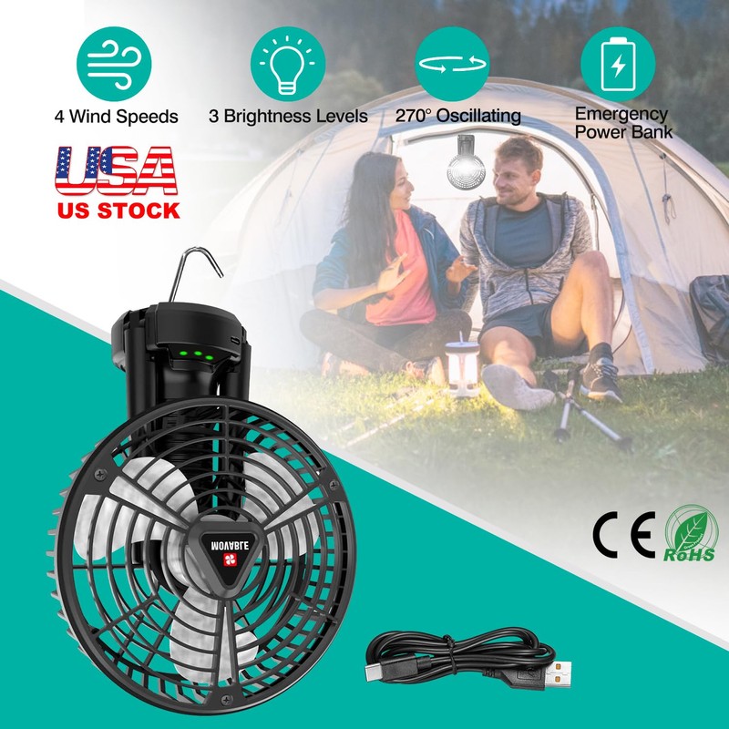 Do you want to enjoy a cool summer both outdoors and indoors? Our camping fan is a must-have companion for your trip. Equipped with 1 foldable tripod and 1 hanging hook on the bottom, our portable fan can be hung in the tent, put on the flat ground or table. Widely used for home and travel. The 4 wind speeds fully meets your different cooling needs. Our fan also features 270º and 180º adjustable angles, which can effectively disperse your surrounding heat and create a cool atmosphere for you. Featured with 12Pcs upgraded LED beads, our tent fan provides 3 brightness levels for portable lighting at night. With a Type-C charging cable, our camping fan can also work as an emergency power bank, making phone charging and self-charging more convenient and easier outdoors.
