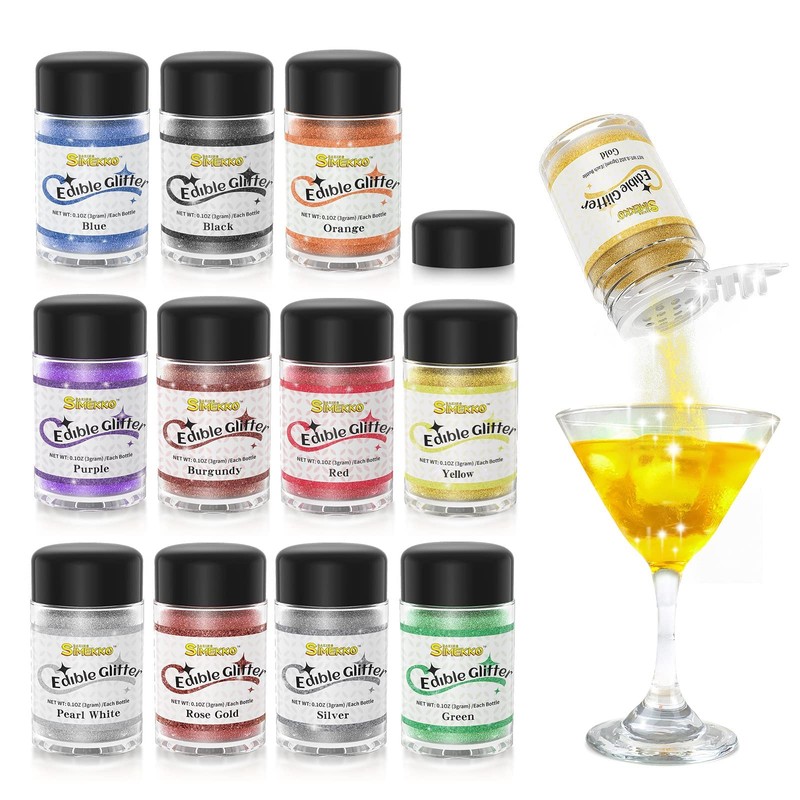 SIMEKKO edible cocktail glitter contain 12colors, 3 gram each color .12Colors included: Gold, Rose Gold, Pearl White, Silver, Black, Purple, Blue, Red, Green, Burgundy, Orange, Yellow.