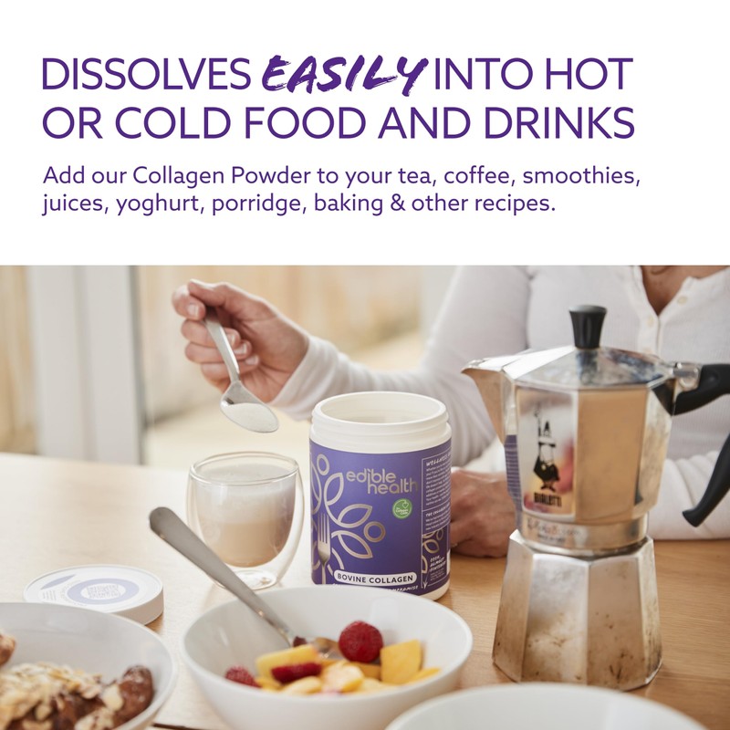 - EASY, CONVENIENT AND FLEXIBLE TO USE: Our pure bovine collagen powder dissolves easily into hot or cold food and drinks. Unlike sachets with fixed servings, fixed tastes and artificial flavours and sweeteners, you can add our powder to your own tea, coffee, smoothies, juices, yoghurt, porridge, broth, baking or other recipes to suit your tastes and lifestyle. We recommend taking 13 grams a day, but you can adjust this to suit your personal health, fitness or medical requirements.