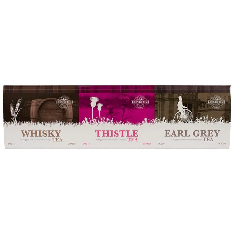 - This pack includes three boxes, each containing 10 string and tag envelope teabags (0.7 oz), with flavors such as Thistle, and Earl Grey. These distinct blends offer a range of tasting experiences, from the smooth, warming notes of whisky to the herbal, slightly sweet essence of thistle, and the classic, fragrant charm of Earl Grey