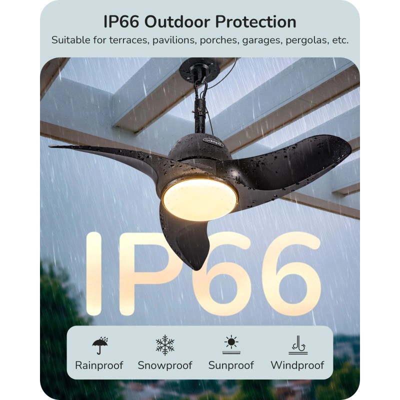 - [IP66 Waterproof & Durable Design] Built to withstand harsh weather, this black lighted ceiling fan features IP66 waterproof protection, making it perfect for outdoor areas like porches, gazebos, and patios; sleek look also complements indoor spaces; two downrod options: 6" and 12" for flexible hanging