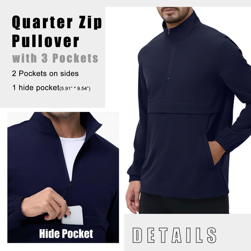 EDITCOZY Quarter Zip Pullover Men Casual Lightweight Windbreaker for Running Golf Jackets with 3 Pockets Navy Blue Large