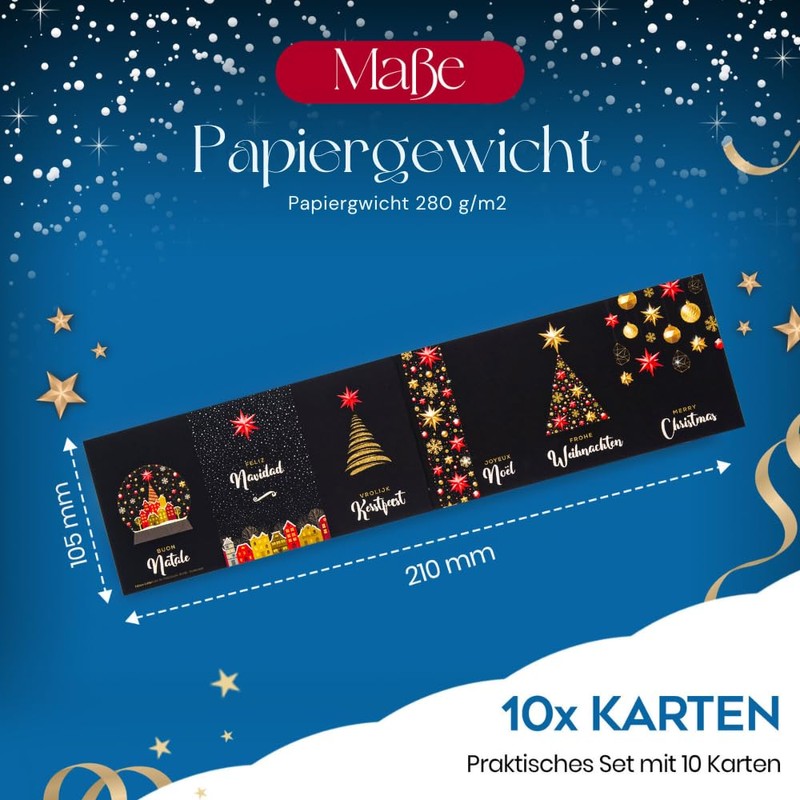 - Innovative design: the set consists of 10 folding cards with 10 Christmas envelopes. The dimensions are 210 x 105 mm (DIN long). With their elegant motif of a festive Christmas tree and the lettering "Merry Christmas", they give every greeting a personal touch.