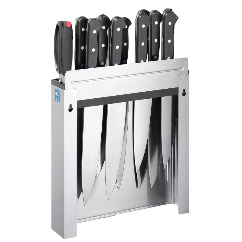 - Model #: KR-699 Holds 8 chef's knives, plus 2 smaller knives, 1 steel and scissors Insert is dishwasher safe and will not dull knives Stainless steel surround is corrosion resistant Knife rack skirt protects the knives and operators from accidents Patented v-slot design holds knives upright and more securely Made In USA