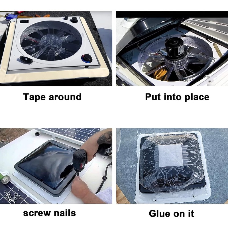 Easy to Install: Frist,Put tape on the edge of the fan and wrap it into one continuous strip. Second,Push the fan into place and the tape will tack ahold of the metal on the van and stuck on security. Third, If necessary, screw in the appropriate screws to hold the fan more securely.
