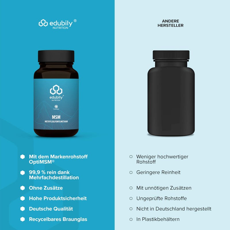 - MARKENROHSTOFF OptiMSM: Wir verwenden den Premium-Rohstoff OptiMSM. Dank Mehrfachdestillation enthält dieser zu 99,9 % reines Methylsulfonylmethan. Er dient dem Körper als wichtige Schwefelquelle.