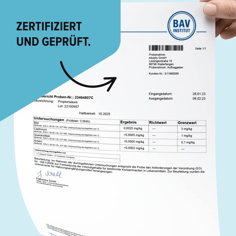 - High product safety: each batch of our propionic acid capsules is tested for heavy metals in an independent laboratory