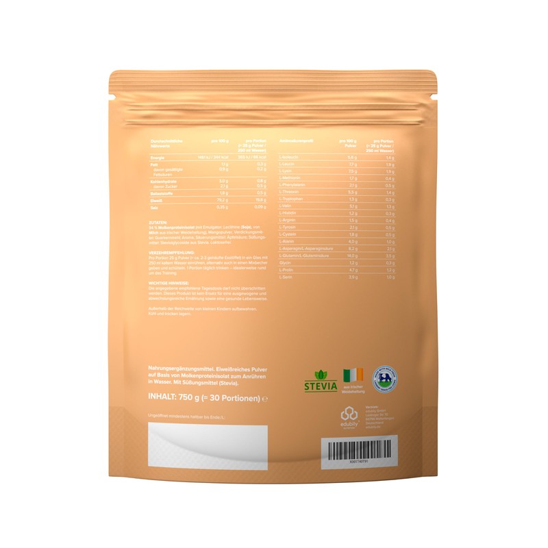 edubily nutrition® Whey Protein Isolate, Lactose Free, Very Soluble Protein Powder without Carbohydrates and Sugar, From Irish Pasture, 750 g (Mango Lassi with Stevia)