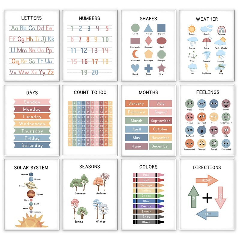 - 12-in-1 Toddler Learning Posters Set:Includes ABC alphabet chart, numbers 1-100 poster, shapes, weather, days of the week, and more—perfect for preschool classroom decor, homeschool, and playroom wall art