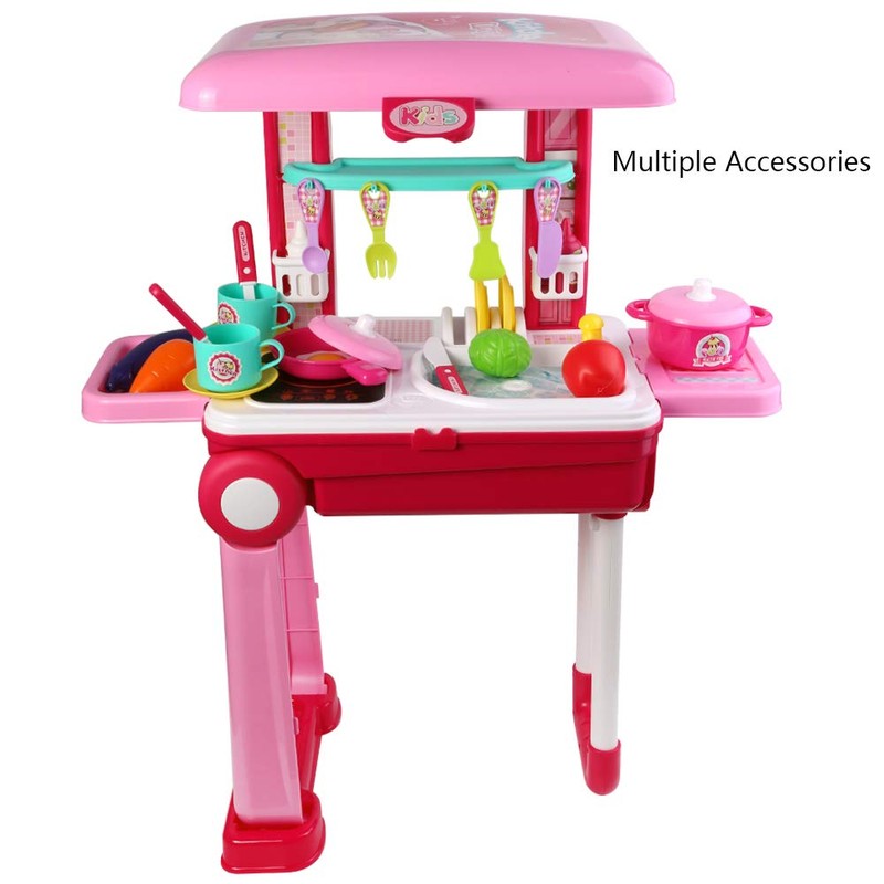 Educational Toys Playset Gourmet Kitchen Cooking Pretend Play Food Set Fold into Luggage Trolley