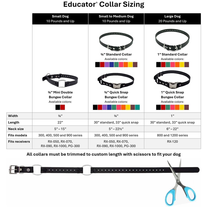 - 3/4" wide collar fits all Educator 300, 400, 500 and 900 series training collar receivers; all other models require 1" wide collar