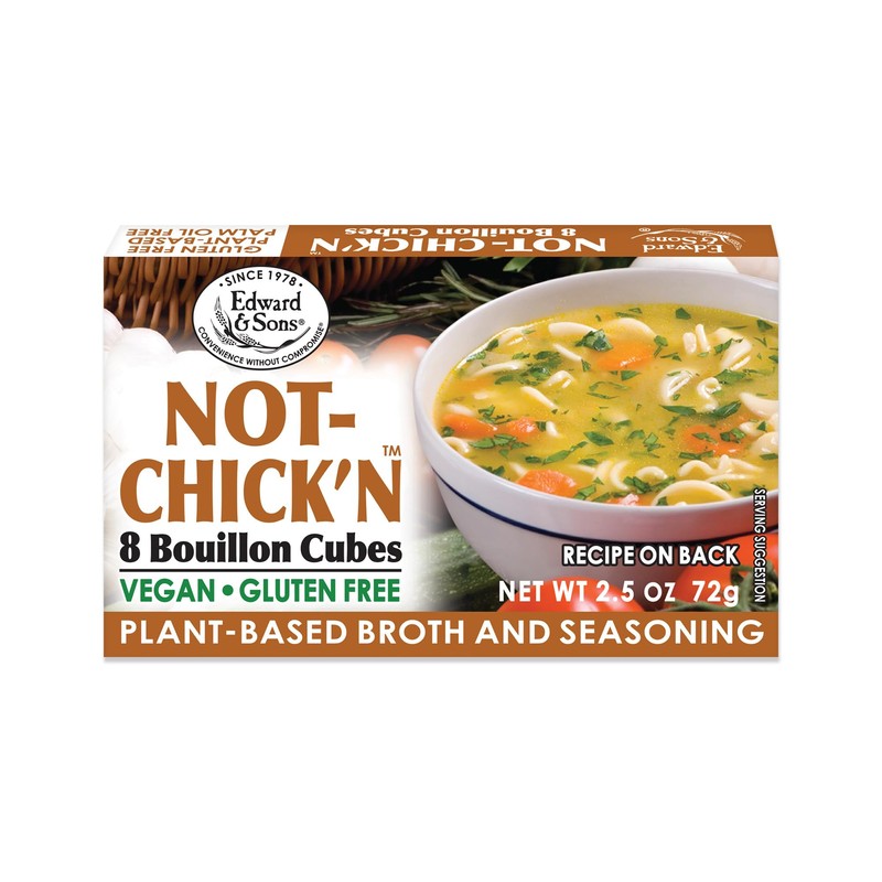 Edward & Sons' Natural Bouillon Cubes make wholesome, satisfying broth in seconds with just hot water. Just mix with hot water for delicious flavored broth, or add to soups, stews and sauces as the chef's secret seasoning. Our vegan cubes are the first to offer the comfort of Not-Chick'n and Not-Beef flavor profiles. Or choose a more traditional Garden Vegetable cube with or without added salt. Store in a cool dry place.