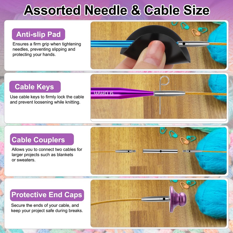- All-in-One Knitting Tools: 13 pairs of 4" aluminum circular needles (3.0mm–10.0mm), 4 cables (16", 24", 32", 40"), 4 needle holders, 2 cable keys, 2 couplers, 1 non-slip pad, and a portable leather case