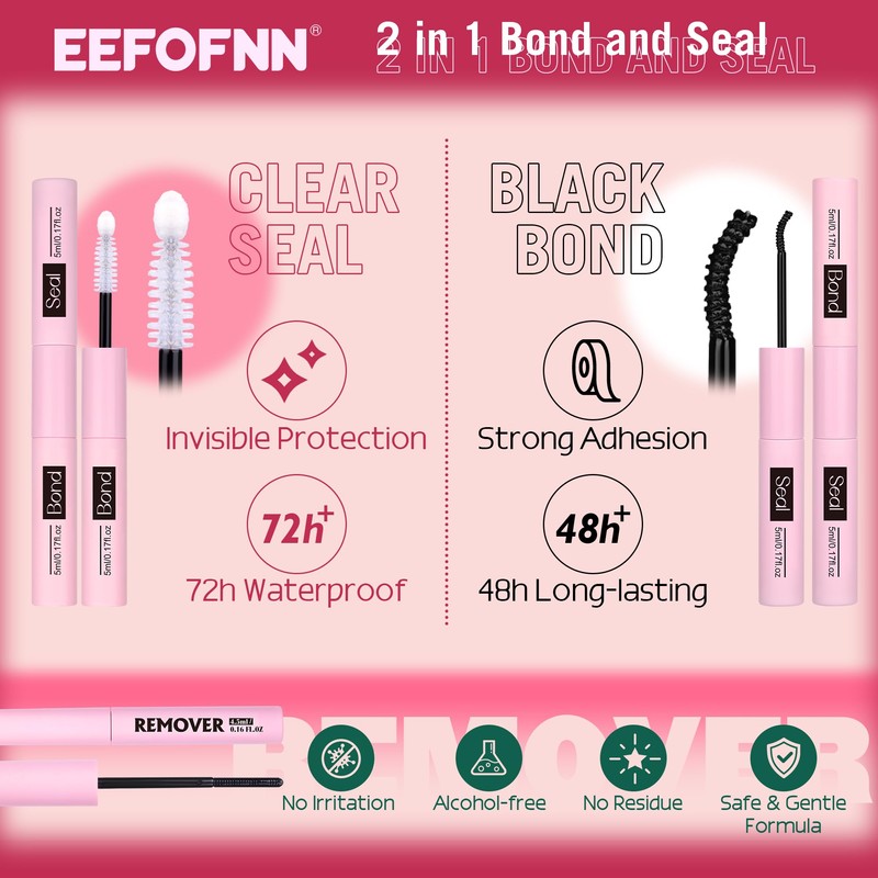 Lash Bond and Seal One end is black BOND, that is, eyelash glue. Apply a small amount to the lash band, wait for about 20 seconds, and then stick the clusters to your eyes. 2-in-1 eyelash glue, is waterproof to keep your lashes looking great all day. The other end is white SEAL, which helps to isolate sticky adhesives and make your eye makeup more refreshing and lasting. Long-lasting effect & More than 24 hours of wearing & Convenient to use