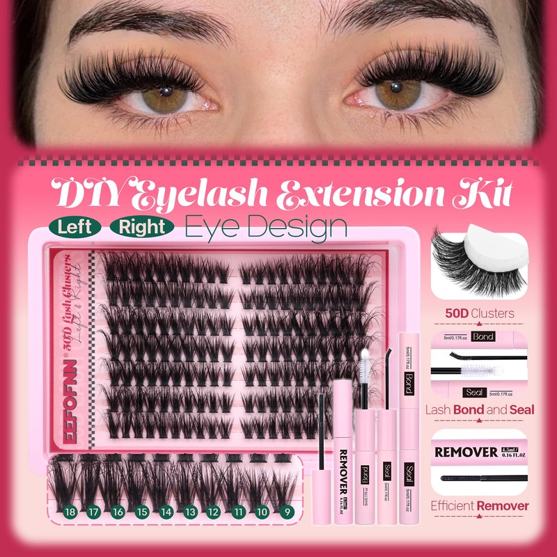 Eefofnn Fluffy Lash Clusters Kit DIY Lash Extension Kit Wispy Cluster Eyelash Extensions with Bond and Seal Lash Glue Remover Volume Eyelash Clusters Kit D Curl Lashes Extension Kit 50D Cluster Lashes