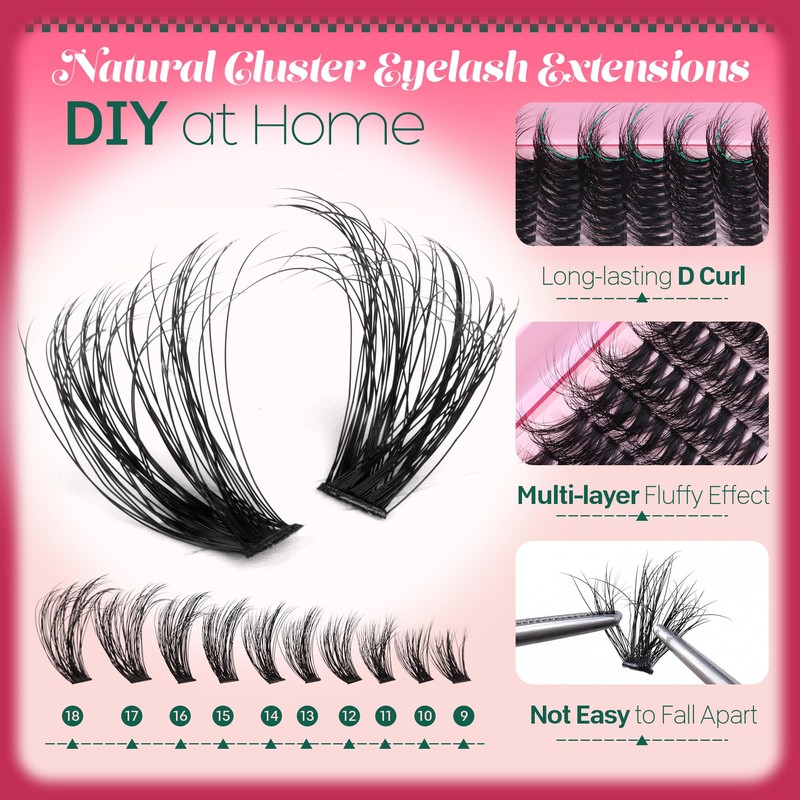 - Left and Right Eye Lash Clusters Design: 9-18mm fluffy individual lashes, pre-matched from short to long, create a glamorous cat eye lashes or mega style. You can diy a professional-looking eyelash extension effect in five minutes