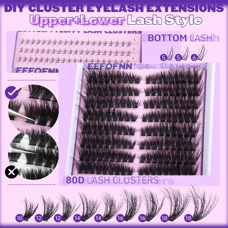 - Upper+Lower Lashes Extension Kit: Fluffy 80D eyelash clusters ranging from 10-18 mm in length can create a salon like lash extensions effect, giving you a charming cat eye lashes style. Natural bottom lashes subtly enhance your overall eye makeup look