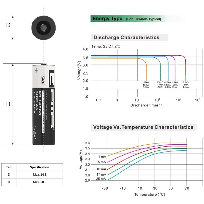 - Basic Info—3.6V NON Rechargeable AA lithium thionyl chloride battery; 2600 mAh; wide range of temperatures -55°C to +85°C; most suitable for low power consumption devices.