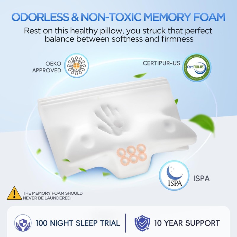 - [CERTIPUR-US CERTIFIED MEMORY FOAM] We've seamlessly merged zero-pressure memory foam with advanced high-density cushioning technology. Conforming to the shape of your body, the cervical neck pillow evenly distributes body weight regardless of sleeping position. And this contour pillow will not become flat and lose firmness after long term use, as all pillows are CertiPUR-US and Oeko-Tex certified, free from harmful substances