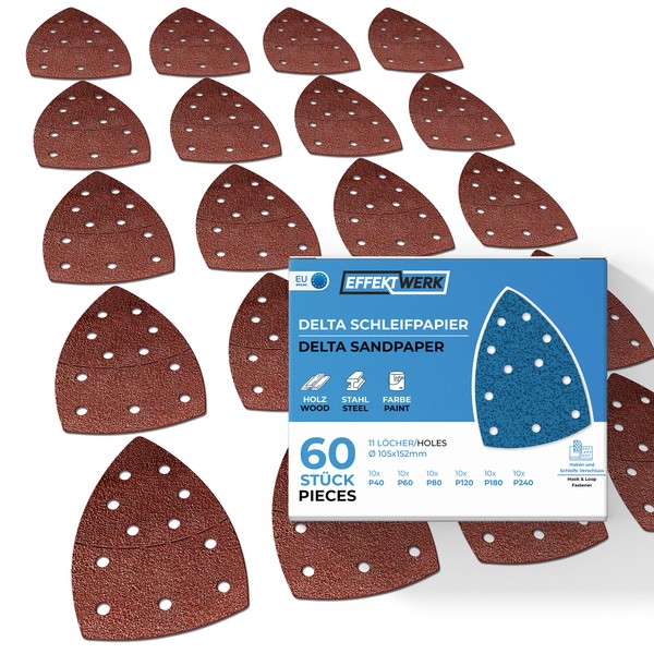 EffektWerk Delta Sandpapers (60 Pack 11 Holes) 105x152mm Triangular Sanding Pads for Mouse Sanders Multiple Grits (40, 60, 80, 120, 180, 240)