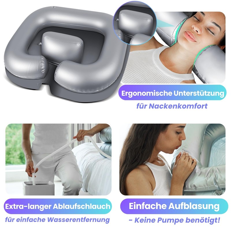 - DURABLE, LEAK PROOF & EASY TO CLEAN: Durable, puncture resistant vinyl withstands repeated use. Inflatable hair wash basin is an indispensable accessory for hair care for the disabled, washing hair for the elderly and hygiene after surgery. Wipe clean with soap and water.