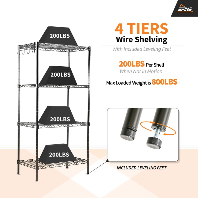 EFINE 4-Shelf Shelving Unit with 8 Hooks and 4-Shelf Liners, NSF Certified, Adjustable Metal Wire Shelves, Shelving Rack and Storage for Kitchen Laundry Bathroom Pantry Closet(23.6W x 14D x 47H) Black