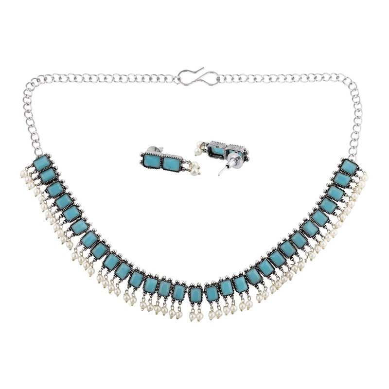 - Oxidized antique silver tone choker necklace earrings jewelry set, embellished with faux pearls kundan and crystal, gemstone and geometric square pattern, gives this jewelry set a perfect traditional cum contemporary look.