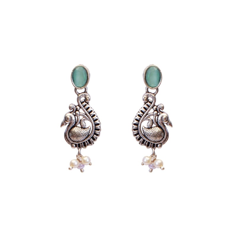 - Oxidized antique silver tone choker pendant necklace earrings jewelry set, embellished with floral religious peacock style pendant faux pearl, rhinestone and crystal, gemstone, gives this jewelry set a perfect traditional cum contemporary look.