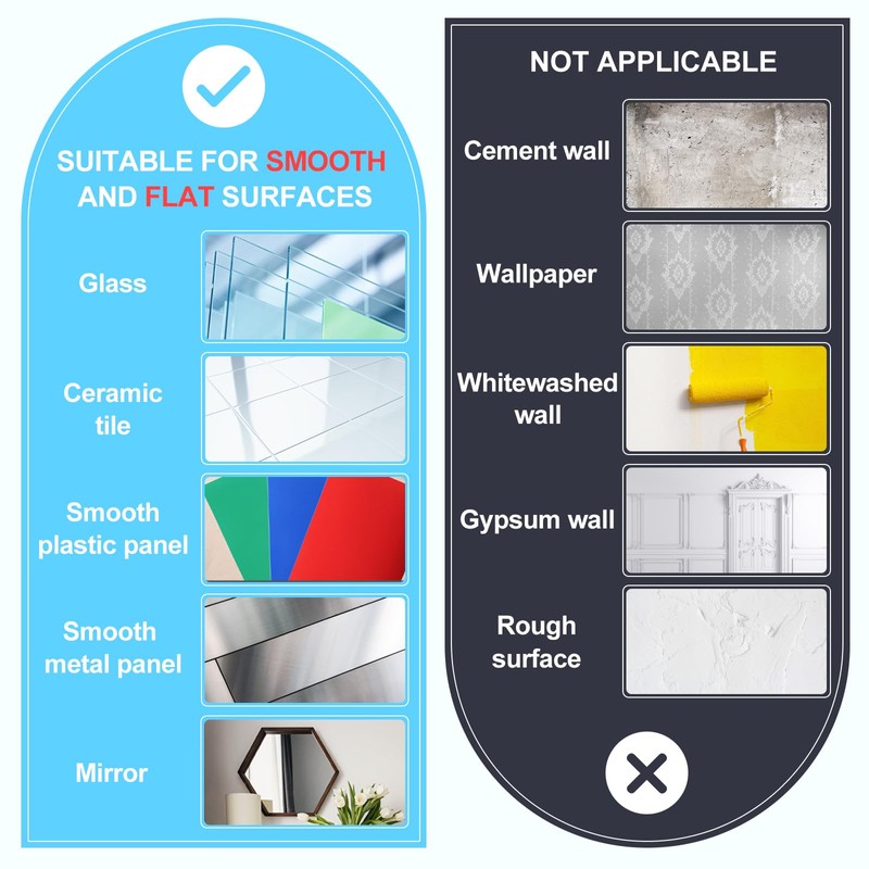 - 【Applicable surface】: suitable for smooth, flat, non-porous surfaces to form a vacuum space, such as glass, tile, smooth plastic and metal, painted panels, etc.Not suitable for wooden panels, wallpaper, walls painted with latex paint, etc.