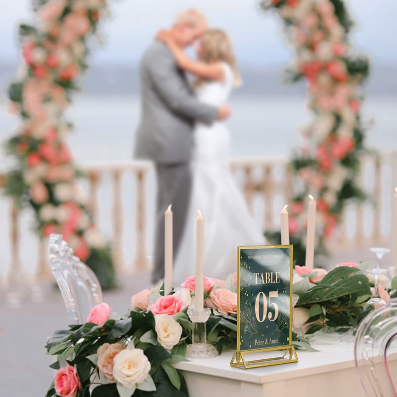 - Two-sided display: with this table stand, you can easily show more information. The acrylic plate with gold rim is pretty, lightweight and practical, stands at 90 degree angle and has a solid triangular base.