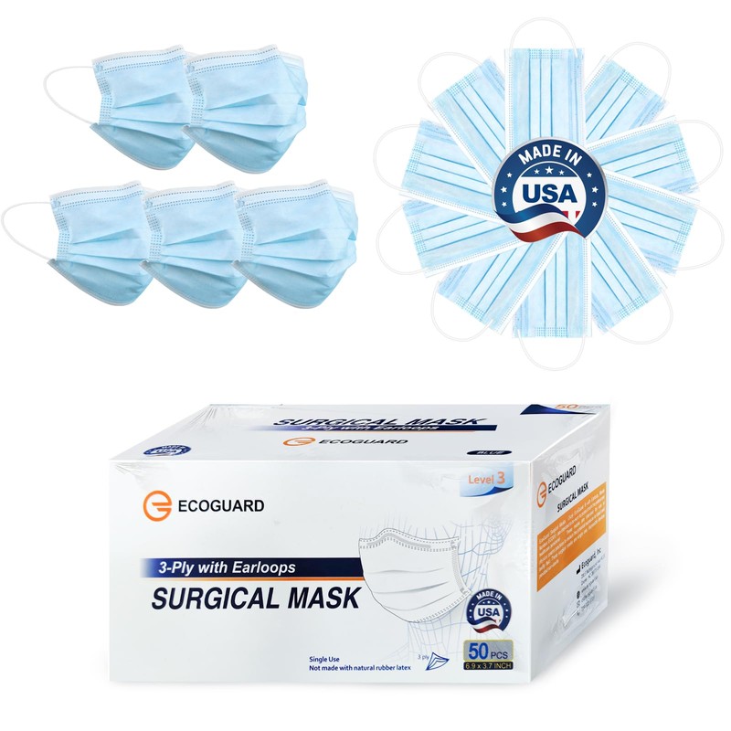EG ECOGUARD Masks Made in USA, ASTM Level 3 Disposable Medical Grade Procedure Face Mask for Protection, 3-Ply EcoGuard B with Earloop, 50 Pack (Model No.: ECO01)