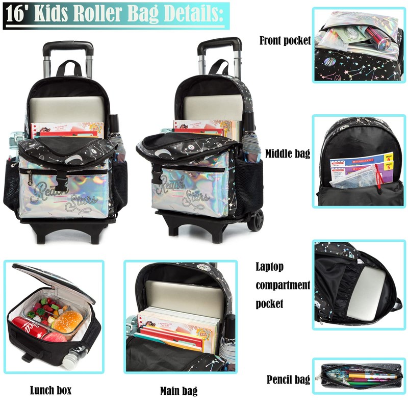 - 💚[Large capacity for schoolbags for Girls] The children's roller trolley backpack contains 1 large main bag, 2 zip front pockets; 2 net pocket storage bags; 1 lunch bag; 1 pencil bag; this set of school bags has enough space to accommodate all the children's supplies in school , Such as pencils, laptops, mobile phones, books, etc.