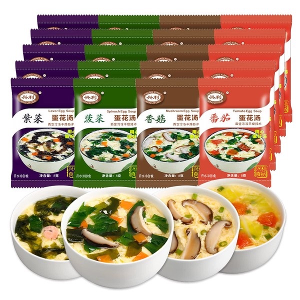 - 4 Flavors Soup : Egg flower soup mix has 4 flavors: Laver Egg Soup, Spinach Egg Soup, Mushroom Egg Soup, Tomato Egg Soup. 20 bags in total, 5 bags for each flavor, Each bag 8G/0.3oz. Note: The date on the package is the date of production, and the shelf life of the product is 12 months.