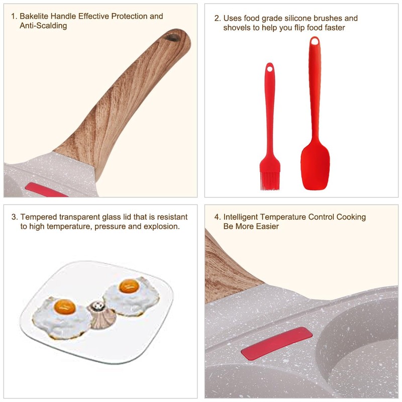 - 🍳MULTI-SECTIONAL DESIGN - This egg frying pan uses a four-hole design, which is perfect for cooking omelets, bacon, burgers, pancakes, etc; It can make cooking faster and easier, and save your time and energy for breakfast