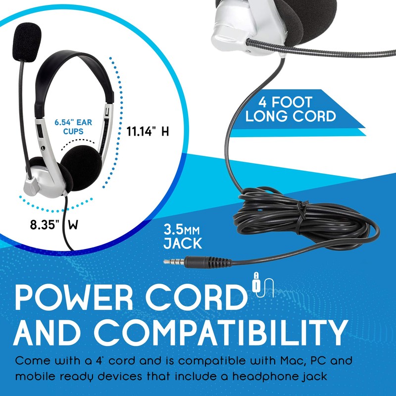 - Adjustable cushioned headband for secure fit & flexible gooseneck microphone / Headphone cord is 8 feet long