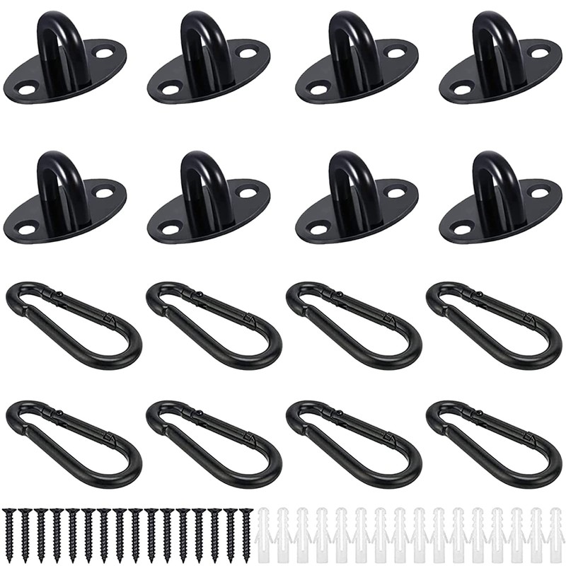 - Package: The package comes with 8 mini pad eye plate hook, 8 carabiner clips, 16 screws and 16 plastic plugs. Super small anchor plates with carabiner clips combination fit in tiny small places, also work with ropes,chains and straps, door eye latch, cabinet knobs, door drawer knobs replacement