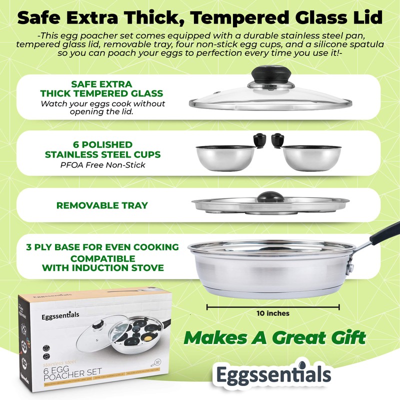 Eggssentials Egg Poacher Pan Nonstick Poached Egg Maker, Stainless Steel Egg Poaching Pan, Poached Eggs Cooker Food Grade Safe PFOA Free with Spatula, Egg Poachers Cookware