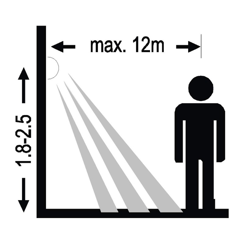 - The motion sensor for wall has a detection angle of 160°, the range extends up to 12 m. The ideal mounting height is 2 m