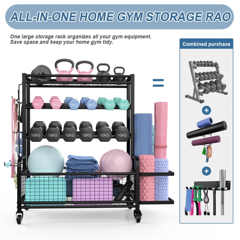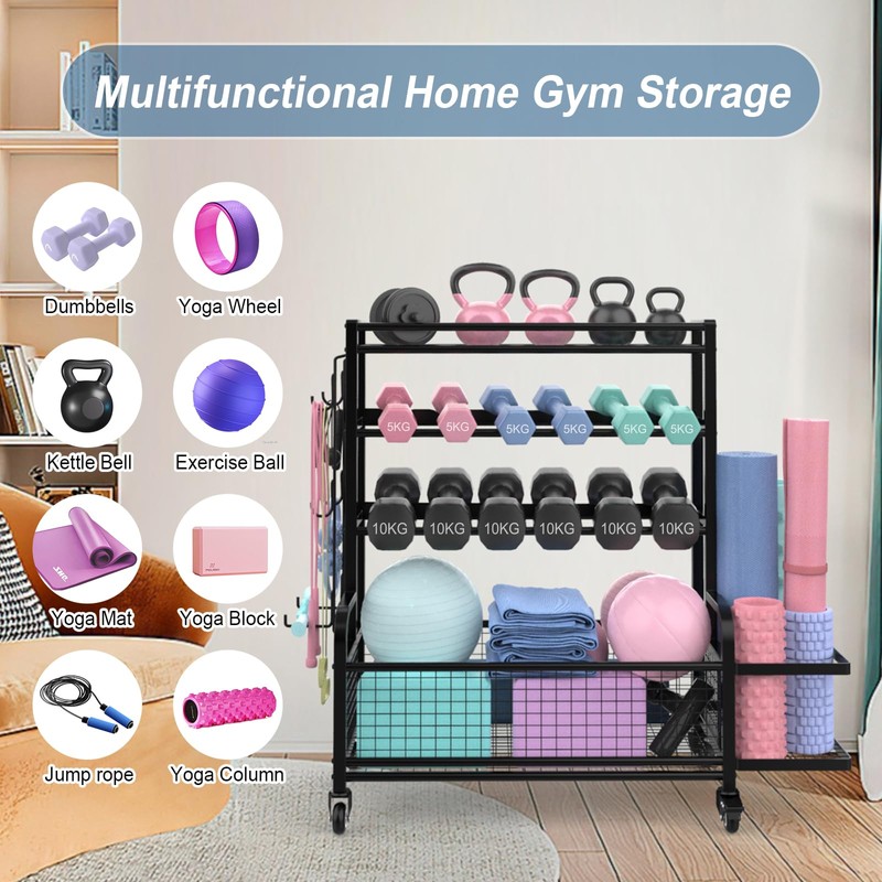- Ultimate Multi-Functional Storage This 4-tier gym storage rack consolidates all your fitness gear into one sleek unit. Designed to hold dumbbells (up to 350 lbs), kettlebells, yoga mats, foam rollers, resistance bands, and accessories, it features adjustable shelves, side hooks, and a mesh basket for versatile organization. Perfect for home gyms, garages, or yoga studios.