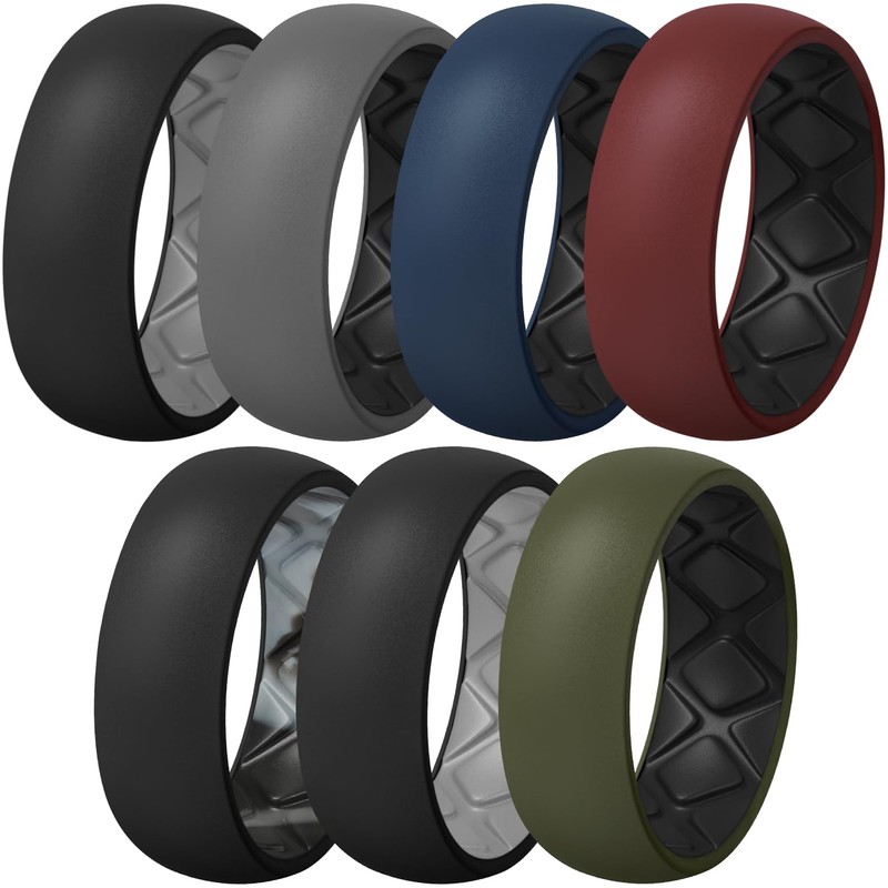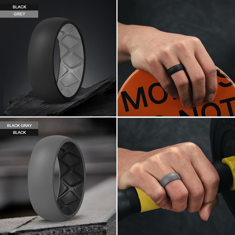 - FLEXIBALE & SAFE: Top grade silicone is hypoallergenic, lightweight and soft. Superior than plastic rings in elasticity, skin adaptability and will break away while rubber wedding bands are under extreme stress to protect fingers. Easy to accommodate temporary swollen fingers or large knuckles and ideal for guys working with tools or electronics