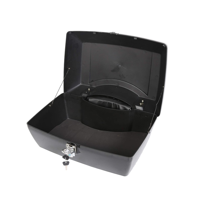 - Function: Motorcycle touring trunk comes with a very nice molded and upholstered backrest and a functional steel top rack. The trunk is extremely spacious and will hold two full-size helmets. It's Fashion, Creative, is a very useful accessory, also as a gift. Note: The key is attached to the box with tape.