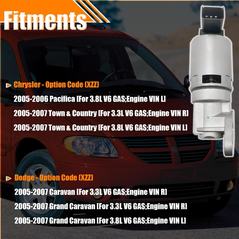 - 【Vehicle Fitment】The EGR Valve Compatible with 2005-2006 Chrysler Pacifica [For 3.8L V6 GAS;Engine VIN L], 2005-2007 Chrysler Town & Country [For 3.3L V6 GAS;Engine VIN R], 2005-2007 Chrysler Town & Country [For 3.8L V6 GAS;Engine VIN L], 2005-2007 Dodge Caravan [For 3.3L V6 GAS;Engine VIN R], 2005-2007 Dodge Grand Caravan [For 3.3L V6 GAS;Engine VIN R], 2005-2007 Dodge Grand Caravan [For 3.8L V6 GAS;Engine VIN L]. Please double check that the model is the same as your car before purchasing.