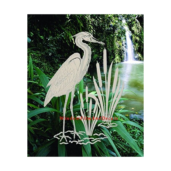 Egret & Cattails Left Oval Etched Window Decal Vinyl Glass Cling - 8" x 12" - Clear with White Design Elements