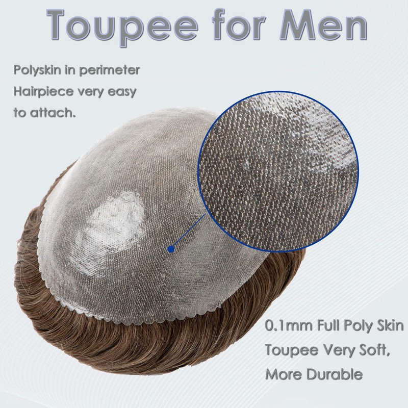 - 1.Toupee For Men is 0.1mm Poly Skin,More Natural and No Shedding.100% High Quality Natural Real Human Hair Mens Toupee,130% Medium Density Mens Wig,Base Size 8x10 Inch.