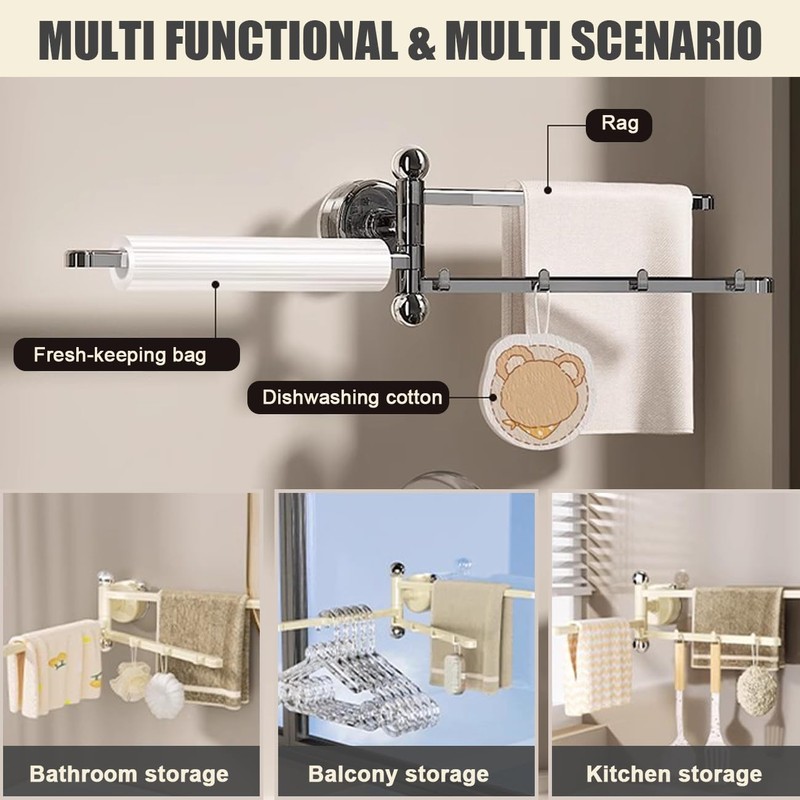 - EASY INSTALLATION: Equipped with a vacuum suction cup, the swivel towel bar can be installed effortlessly without drilling holes or leaving marks on your walls. Simply clean the surface where you want to install it, remove the protective film from the suction cup, and tighten it by rotating the small ball clockwise until secure. The suction cup adheres firmly to smooth, hard surfaces but is NOT recommended for rough or uneven walls