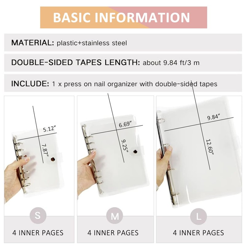 - FLEXIBLE DESIGN: The outer cover effectively blocks dirt and water from entering, while the snap closure allows for easy opening and closing. High transparency design helps you see inside items at a glance. Double-sided tapes provide strong adhesive to securely stick the press on nails to four inside pages that allow for order display, enough long to offer a longer use time. The metal 6-ring binder offers excellent flexibility to add or replace inside pages more conveniently