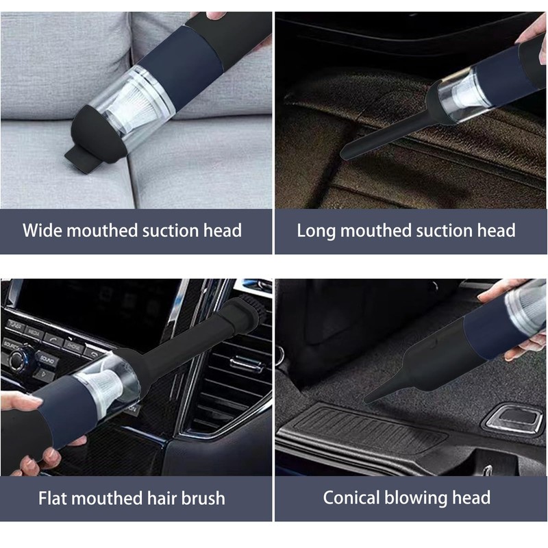 3.Der Handstaubsauger aben auch 3 verschiedene Reinigungsköpfe:einen flachen Düsenkopf,eine Bürste und einen Blasdüse,kann verborgenen Staub von Sofas,Betten, Autos, Tastaturen, Computern,Laptops, Druckern,Handtaschen. Geeignete Reinigung für Auto,Haushalt und Büro.