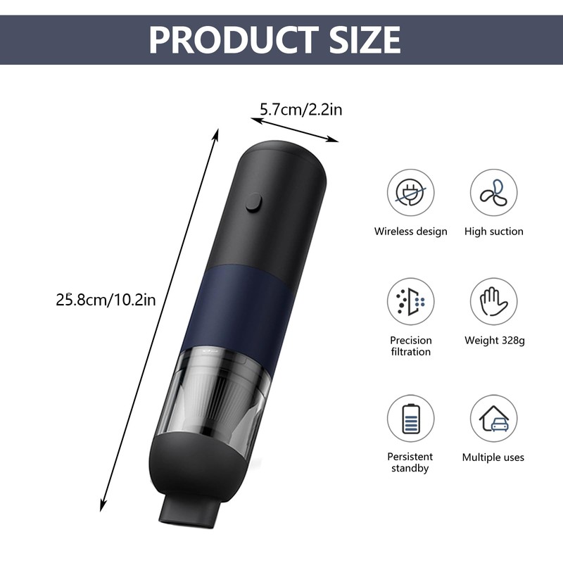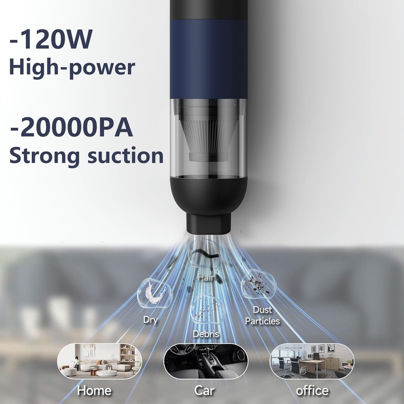 1.Der Handstaubsauger bietet eine Saugkraft von bis zu 4000Pa und 120W Leistung,ausgestattet mit einem Hochleistungsmotor die die Verwendung von täglichen kleinen Reinigungsarbeiten erfüllen kann.